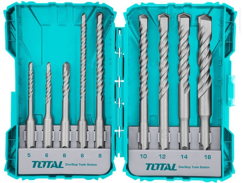 El juego contiene nueve brocas de diferentes tamaños. Tres de las brocas tienen una longitud de 110 mm y diámetros de 5, 6 y 8 mm. Las seis brocas restantes tienen una longitud de 160 mm y diámetros de 8, 10, 12, 14 y 16 mm.
