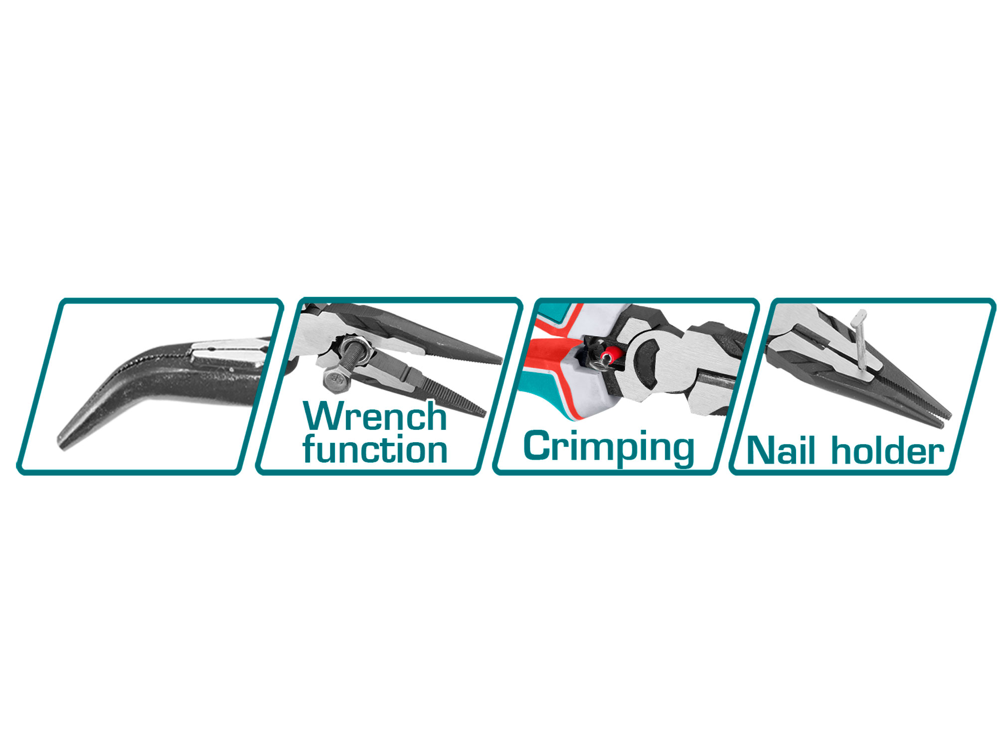 Total Además de sus funciones estándar, los alicates de media caña doblados también ofrecen una función de engarce, una función de soporte de clavos y una función de llave. Estas funciones adicionales las convierten en una herramienta aún más valiosa que le ayudará a realizar diversas tareas con mayor eficacia.